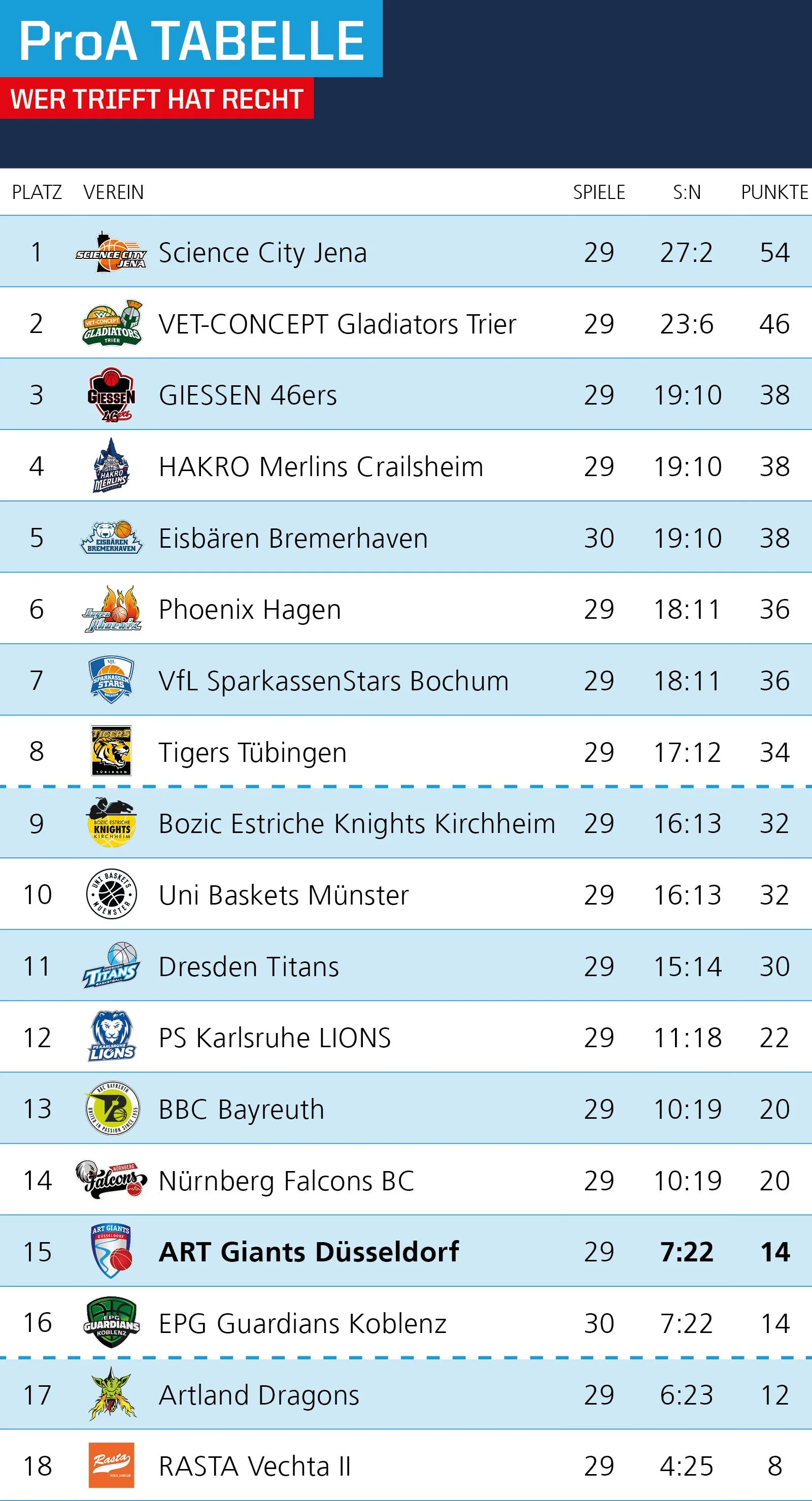 Der Sieg in Crailsheim in der letzten Woche war wichtig - vor allem, wenn man einen Blick auf die Tabelle wirft. Realistisch gesehen ist es ein “Triell”, das dort am Tabellenende stattfindet: die Artland Dragons, Koblenz und die Giants kämpfen um den Abstieg. Theoretisch könnte zwar Vechta noch eingreifen, und selbst Karlsruhe auf Platz 12 könnte noch absteigen - aber eben nur theoretisch.