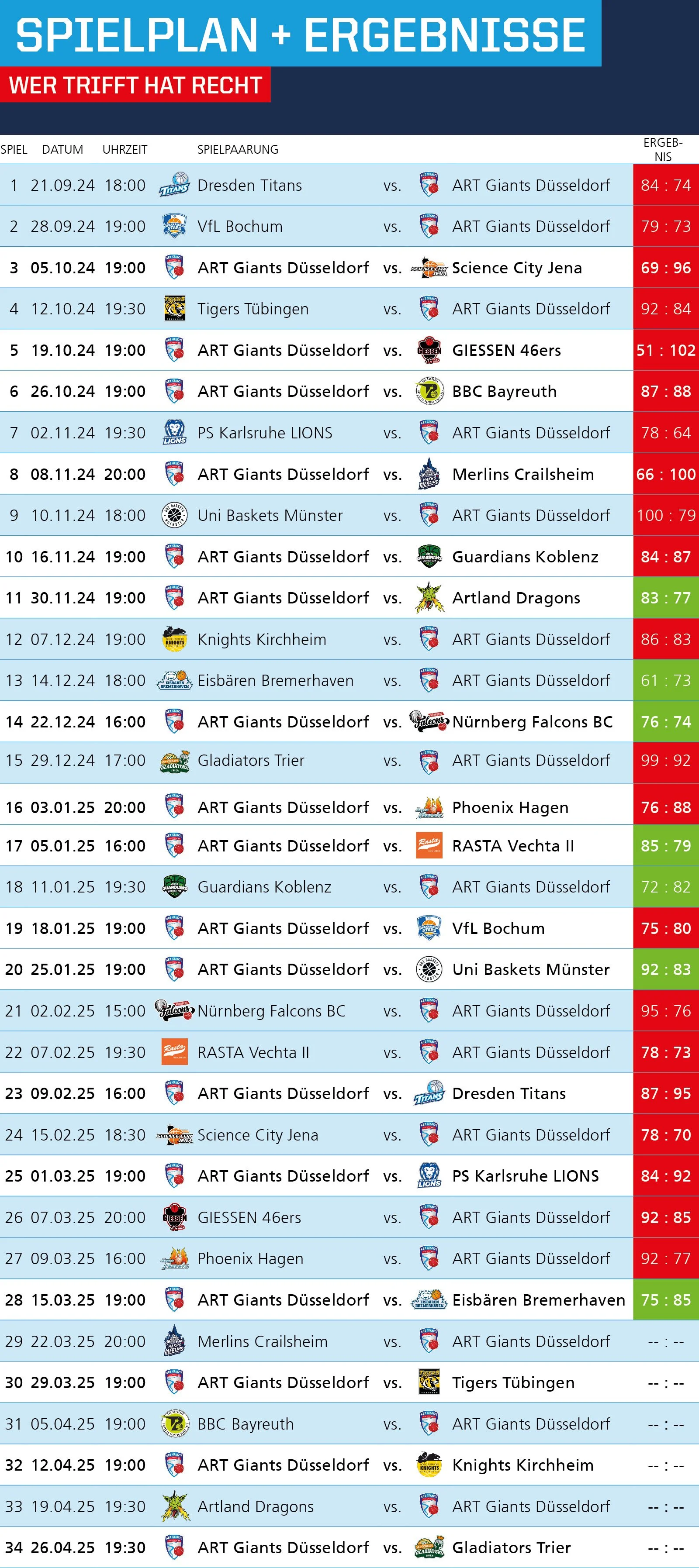 Ein Blick auf die Tabelle zeigt eindeutig, dass für die Giants ein Sieg angesagt ist. Hinter den Giants (aktuell Tabellenplatz 15.) stehen punktgleich die Guardians Koblenz, auf den Abstiegsrängen folgen die Artland Dragons mit einem Sieg weniger sowie das Farmteam aus Vechta mit vier Siegen. Allerdings haben vor allem die Artland Dragons das vermeintlich einfachere Restprogramm, was sich auch am kommenden Spieltag widerspiegelt.