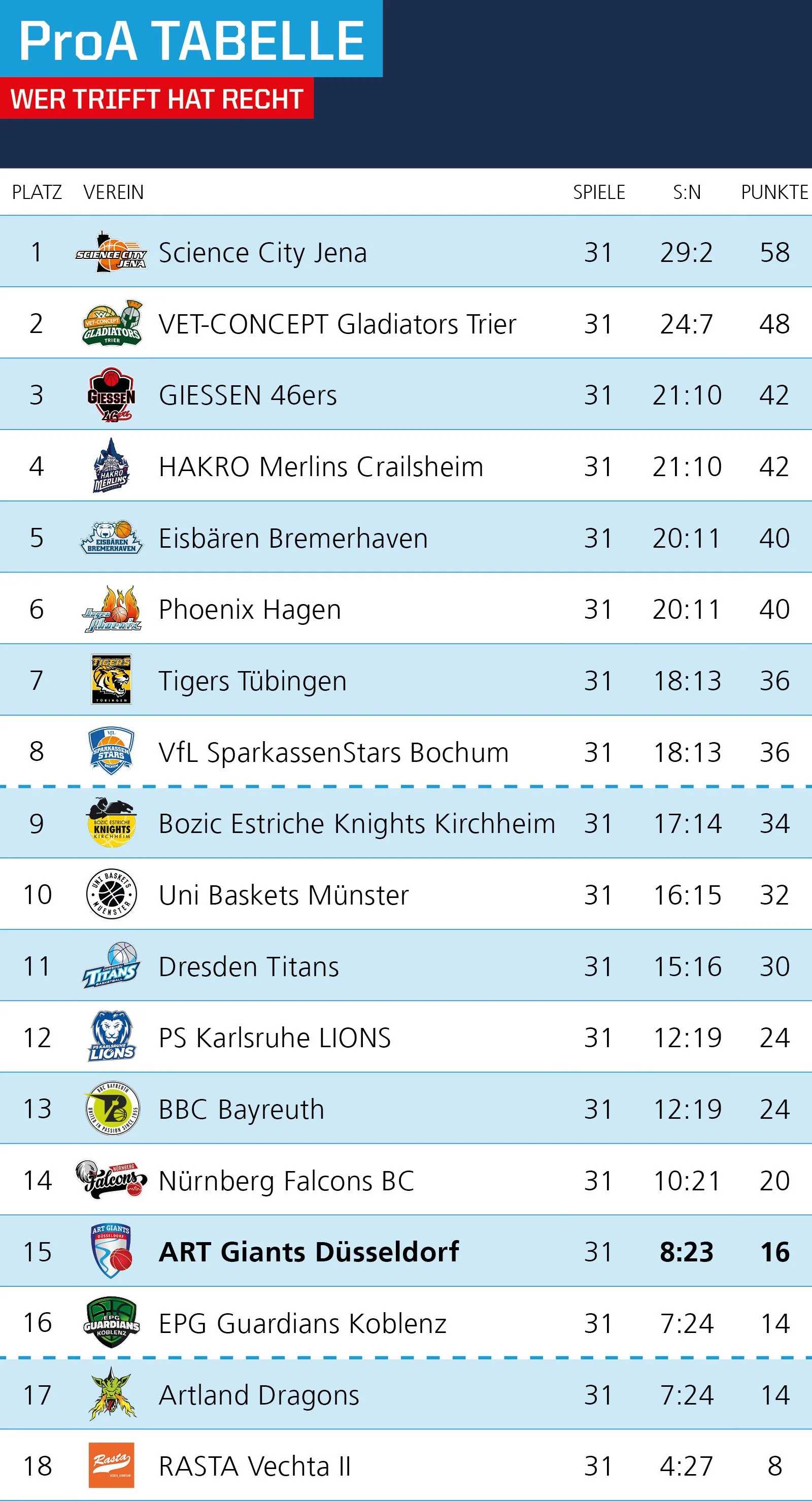 Die verbleibenden 3 Spieltage haben nun das Zeug dazu, sich zu einem echten Krimi zu entwickeln. Mit den Artland Dragons, den Guardians Koblenz und den ART Giants kämpfen drei Mannschaften um den Abstieg.