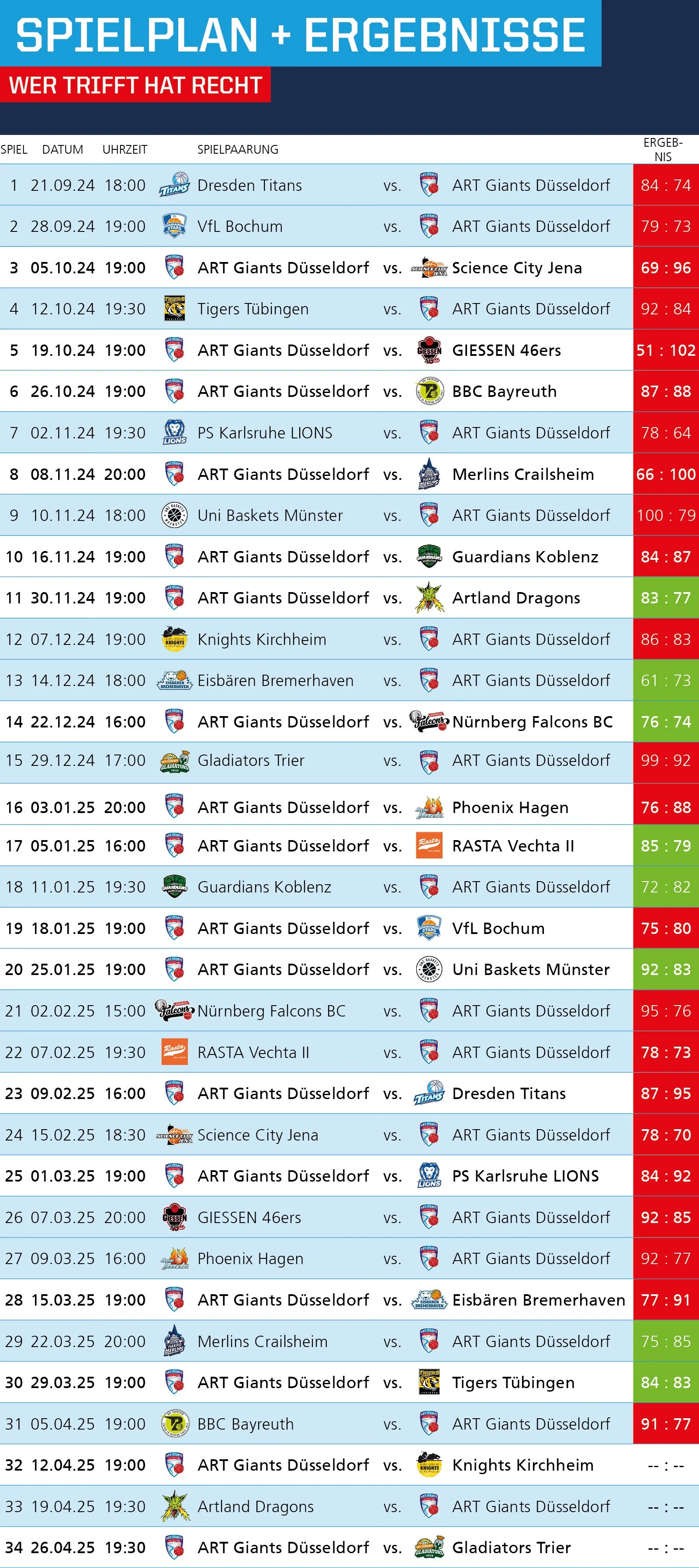 Für die Giants geht es darum, ihre starke Form aus den letzten Spielen beizubehalten und den Klassenerhalt endgültig zu sichern. Die Siege gegen Crailsheim und Tübingen haben gezeigt, dass das Team nicht nur kämpferisch ist, sondern auch spielerisch überzeugen kann. Mit der Unterstützung der Fans im CASTELLO Düsseldorf wollen sie den Favoriten aus Kirchheim erneut ärgern und vielleicht sogar deren Playoff-Träume durchkreuzen und dabei selbst einen wichtigen Schritt Richtung Klassenerhalt gehen.